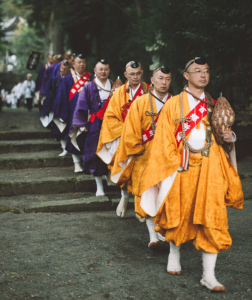 これは、加藤清正が熊本城を建てる際、山伏を招いて築城の無事を祈ったという故事にならい、醍醐派の青年僧侶約100名を、清正公を主祭神とする加藤神社に集結、地鎮祈祷を行ったもの。同様に、阿蘇神社においても祈念法要を厳修。響き渡る法螺貝の音は、熊本地震への復興の祈りを天に轟かせるようでした。