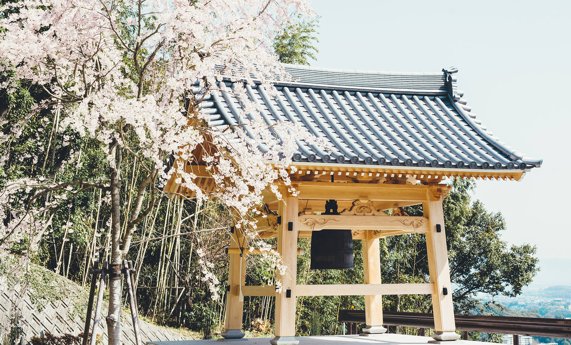 当苑に植樹された「醍醐の桜」横には、熊本地震一周忌に合わせ「鐘楼堂」が建立されました。これは、熊本地震からの復興を願ったもの。鐘は自由に撞くことができ、荘厳な音を響かせてくれます。