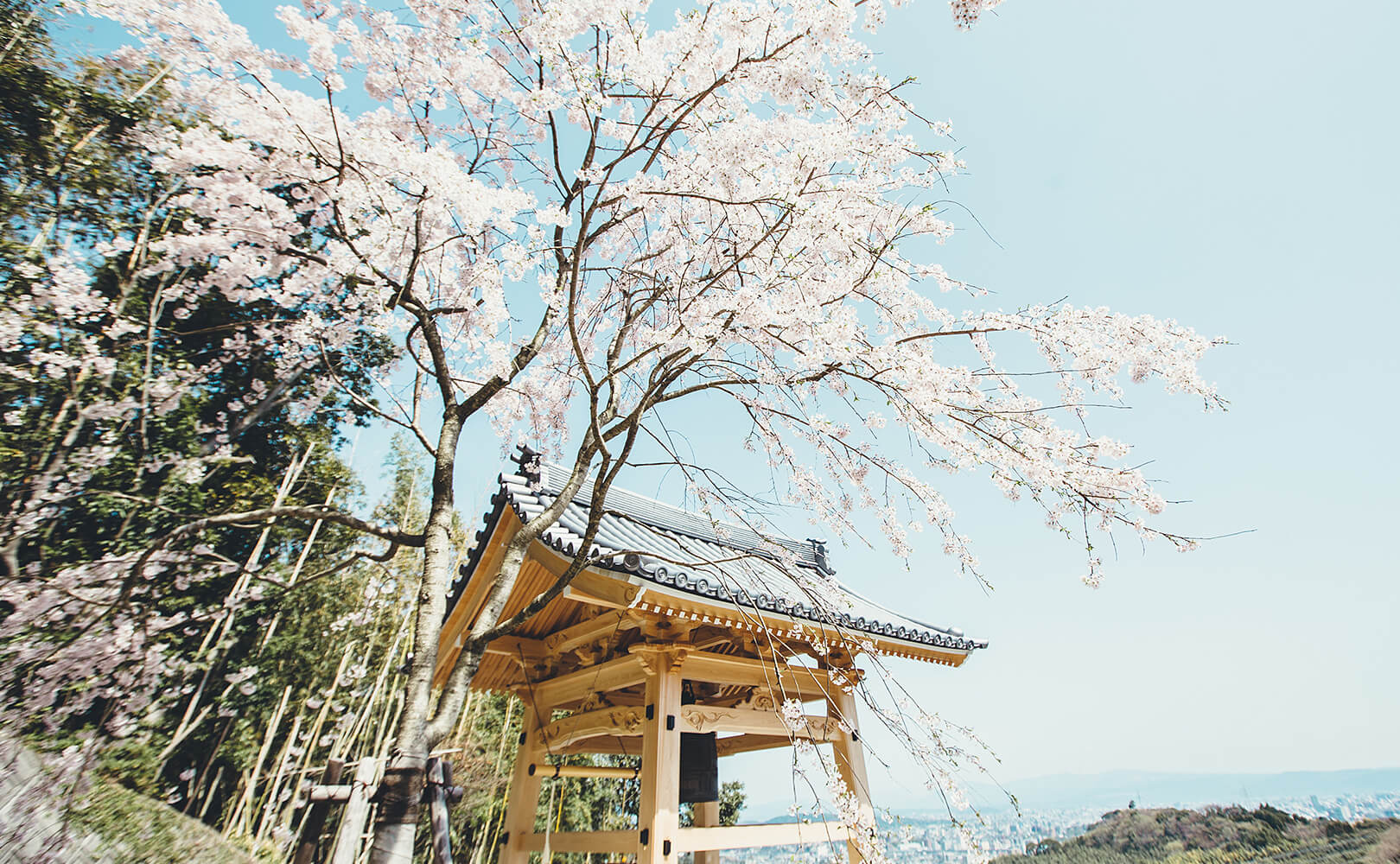 菩提樹苑のいちばん高台では、鐘楼堂と1本の桜の木が熊本を見下ろしています。私たちが桜の木を植樹し、梵鐘を建立したのは熊本地震発生の1年後。復興への祈りを込めての取り組みでした。桜の木と梵鐘についてご紹介します。