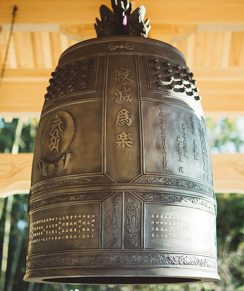 宇治平等院の国宝の鐘を模写した「平等院型」。鐘の直径は三尺(約0.9m)、鐘身(高さ)は五尺六寸(約1.7m)、重さ250貫(約940kg)の大鐘です。本蔵院の御本尊である不動明王の種字の梵字や仏教の悟りの言葉、百螺祈願の内容に加え、この鐘の建立にご賛同いただいた方のお名前も彫られています。